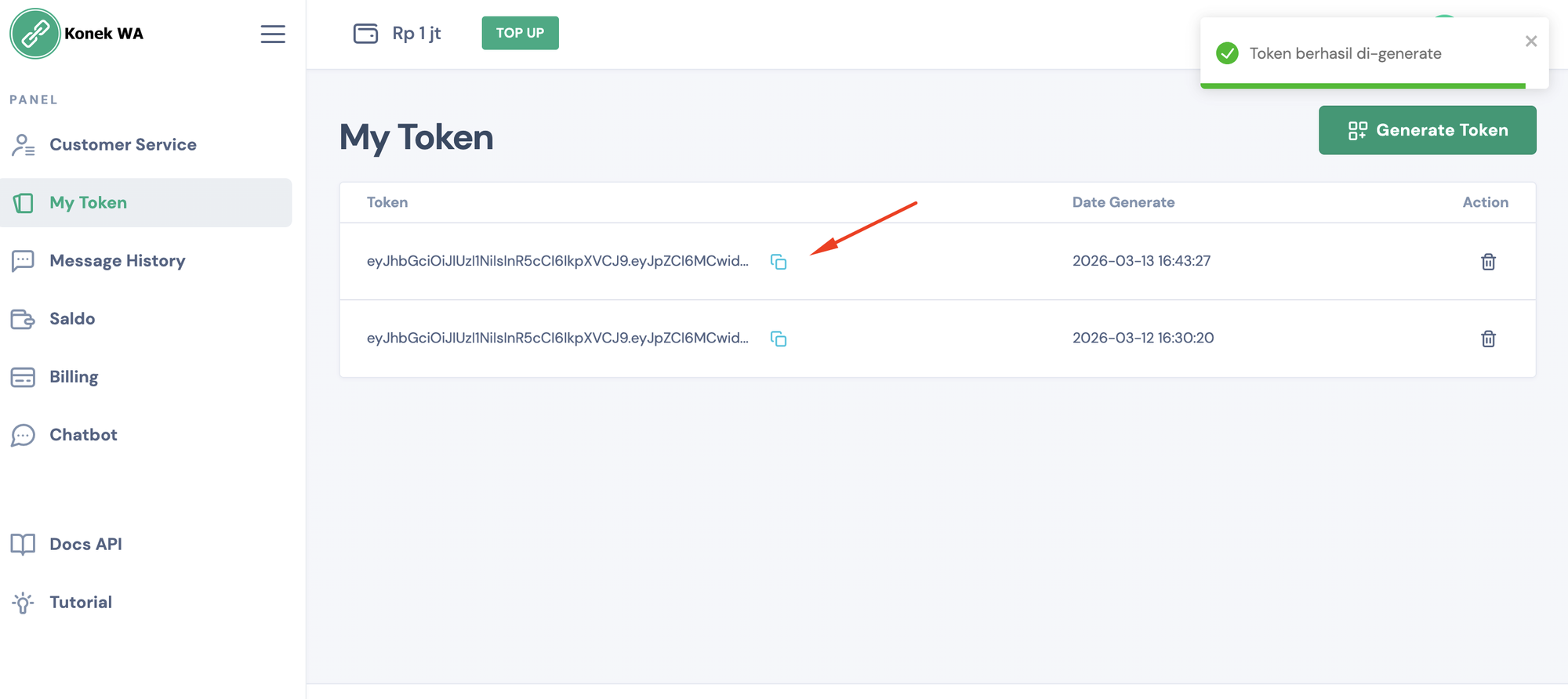 - Token anda siap digunakan untuk integrasi API KonekWa.