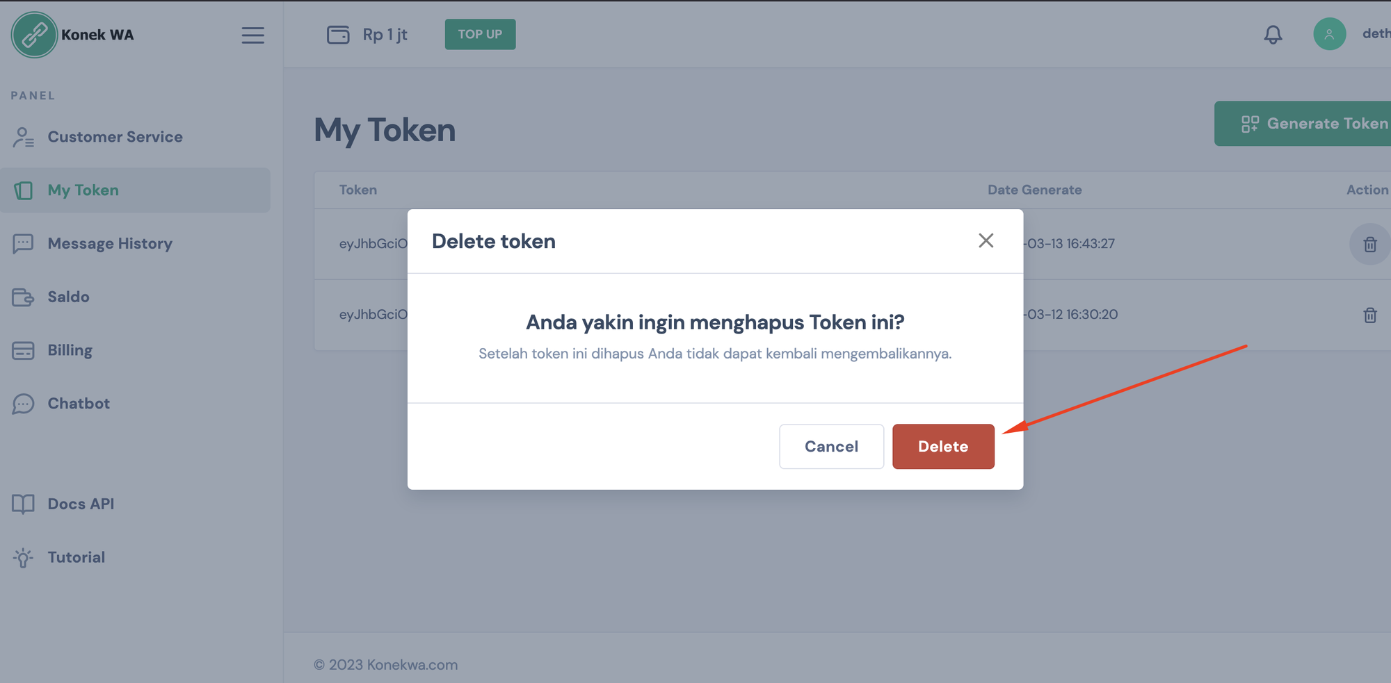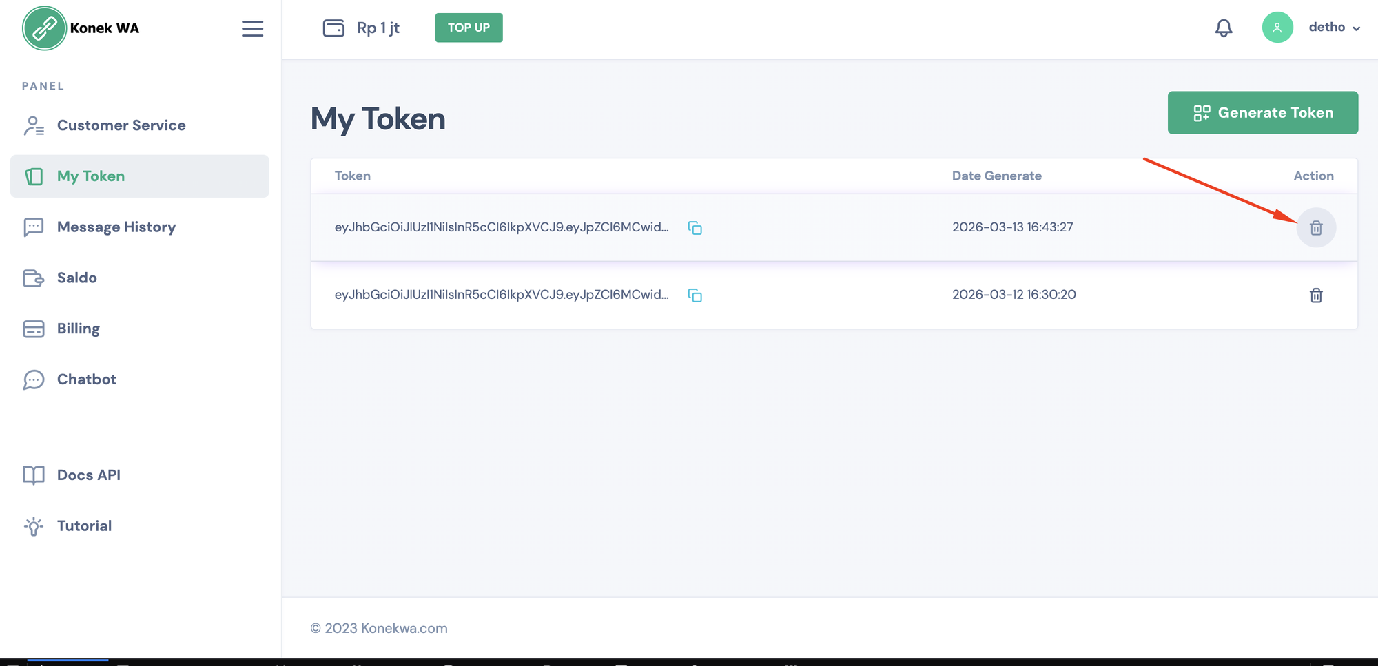 Penjelasan : Pada panel konekwa anda dapat melakukan pembuatan token dimana token ini digunakan untuk authentikasi anda untuk menggunakan API dari KonekWA.