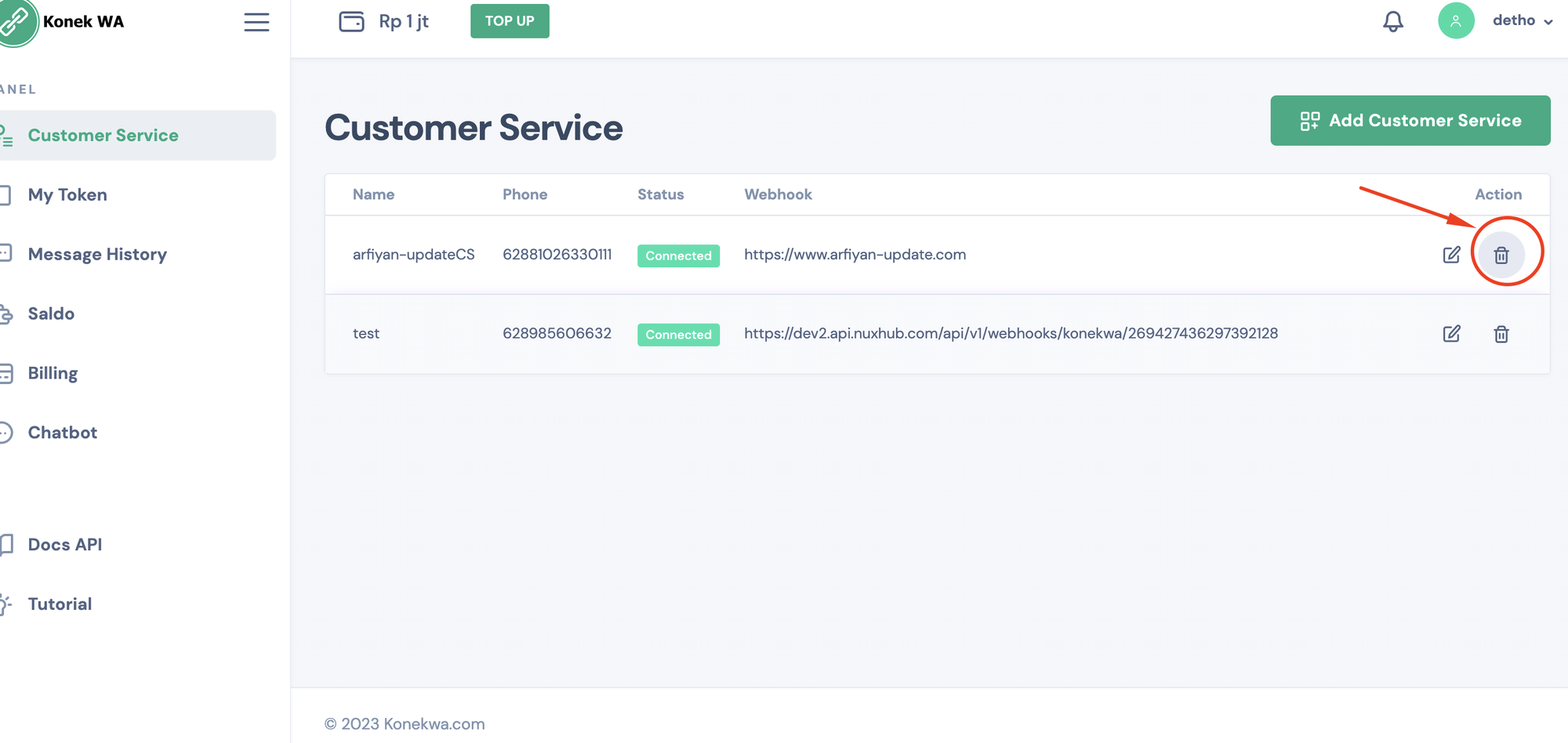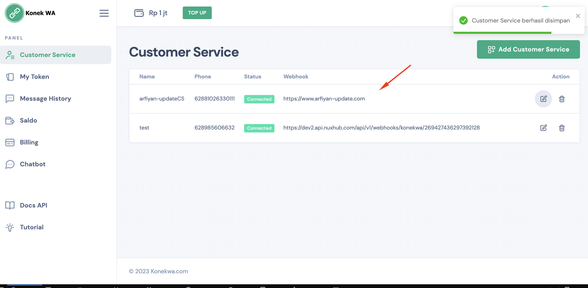 Penjelasan : anda dapat melakukan perubahan ( nama dan webhook) dan penghapusan data CS anda.